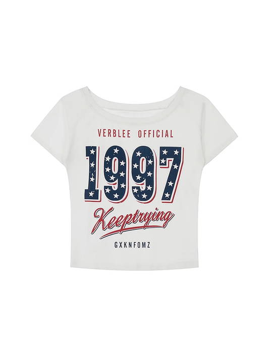 White Neck Vintage Round Asymmetrical Neckline Number Print
