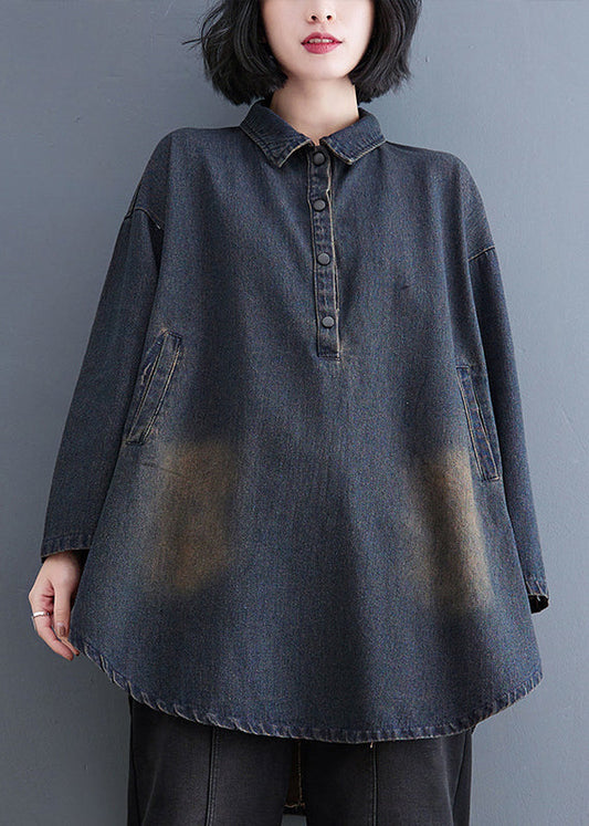Blue Retro Fall Patchwork Collar Shirt Peter Pan Denim
