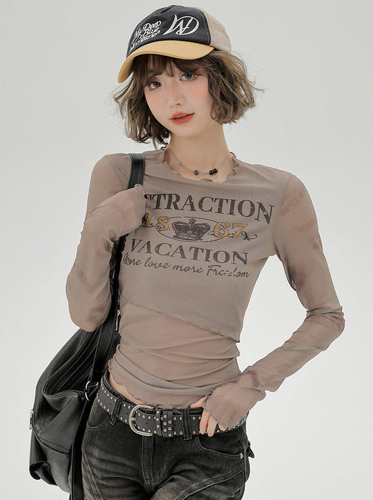 T Long Retro Print Sheer Ruffle American