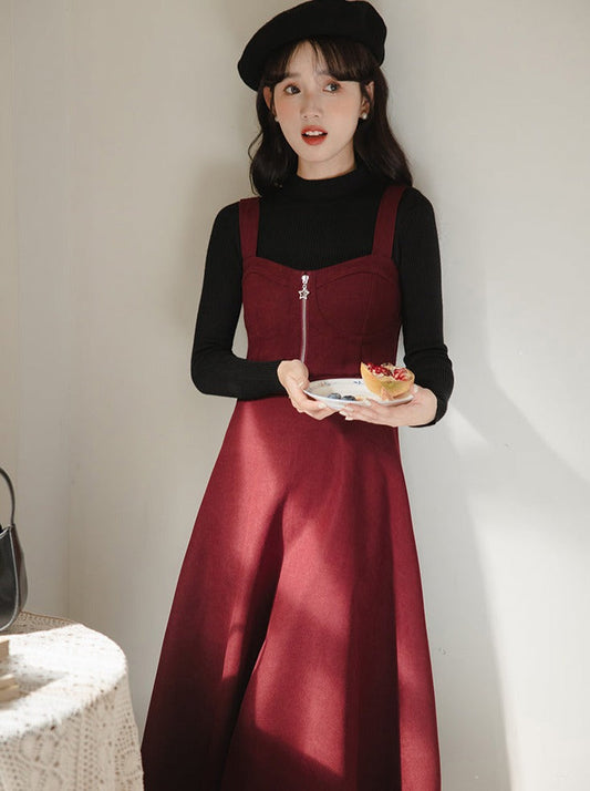 Slim Knit Retro Half + Suspender Turtleneck Skirt