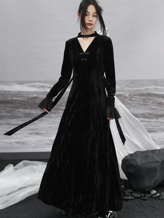 Splicing Stand Chinese V-Collar Mesh Romantic Retro Velvet Black Dress