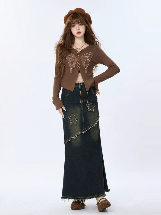 Slit Asymmetrical Damaged Skirt Denim Retro