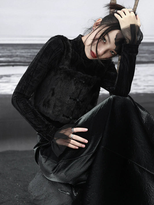 Velvet Dark Turtleneck Splicing Shirt Mesh Retro
