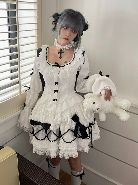 Suspender Retro Shirt Ruffle Ribbon Skirt Elegant Sleeve Black + Volume Shoulder