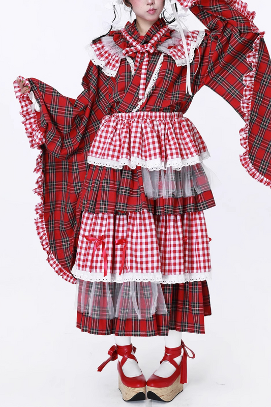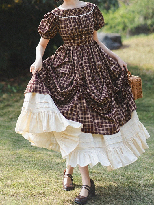 Red Cottagecore Off-the-shoulder Neckline Sleeves Plaid Dress Fashion Short Retro