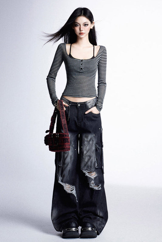 Raw Wide-Leg Jeans Waist Bowknot Appliques Blue Low Hem Vintage