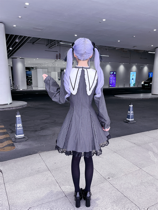 Vintage Black Striped Jirai Kei Dress with Pointed Flat Collar and Cross-Stitch Lace Trim