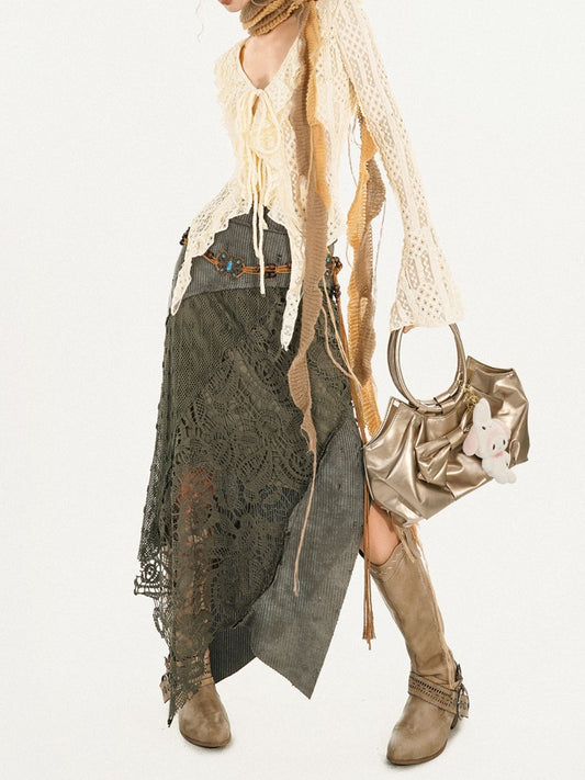 Lace Patchwork Vintage Green Asymmetrical Knit Skirt with Cutout