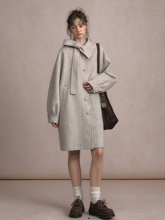 Gray Beige/Dark Vintage-Inspired Long Wool Coat with Front Button Placket and Bow Tie Collar
