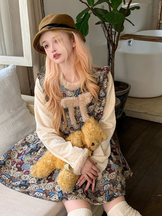 Dress with Plush Bowknot Faux Two-Piece Design Vintage Bear Print Brown