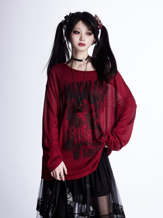 Graphic Vintage Coverup Red Semi-sheer Asymmetrical Neckline Sun Protection