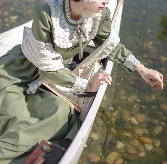Ruffle Floral Vintage Neckline Dress Green Embroidery Matcha with