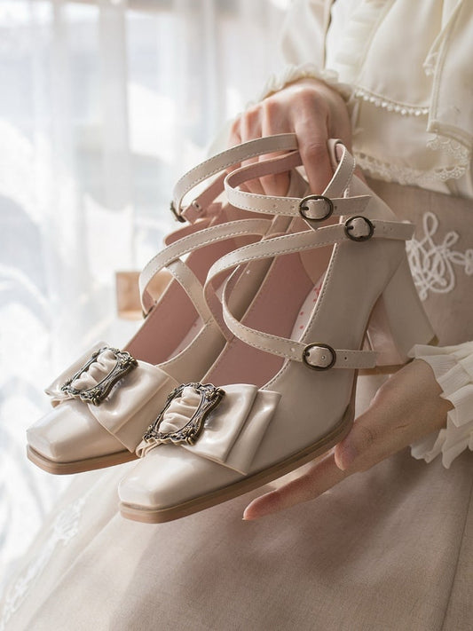 Frame Mid-heel Bow Picture Beige Design Classic Square Lolita at - Top Shoes Toe Vintage