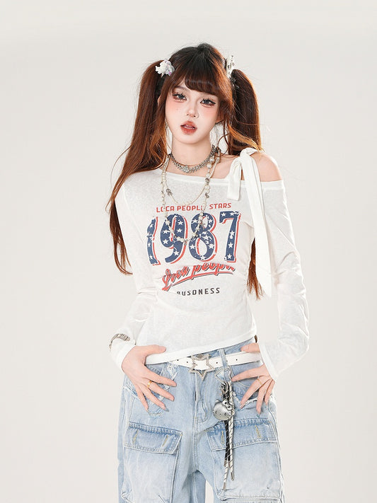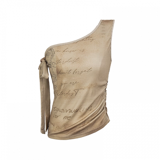Apricot Graffiti Print Vintage Wasteland Punk Asymmetrical Neckline Top