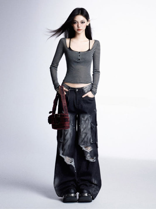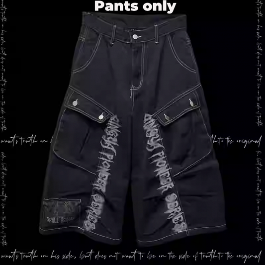 Jeans Black Punk Print Vintage Wide-Leg Cargo