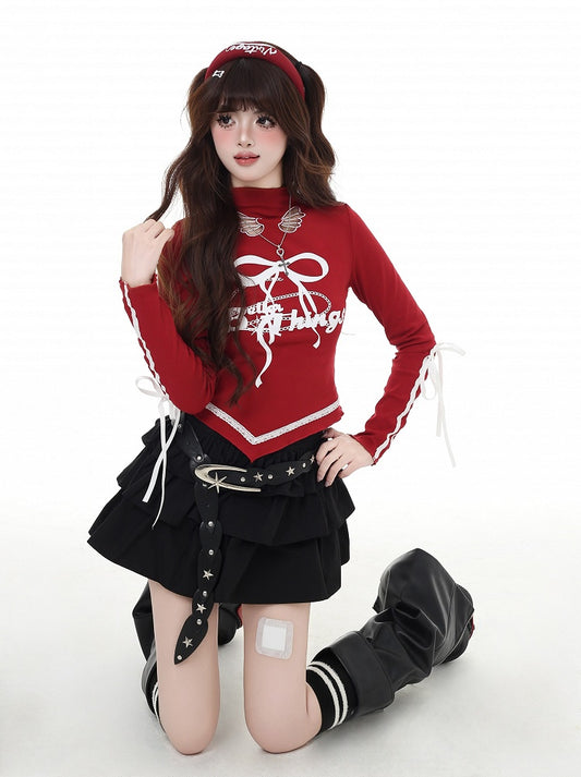 Print Cutout Bowknot Curved Hem Top Red/Black Mock Wing-shaped Vintage Neck