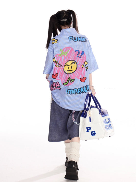 Vintage Embroidery Blue Striped Shirt Short Sleeves