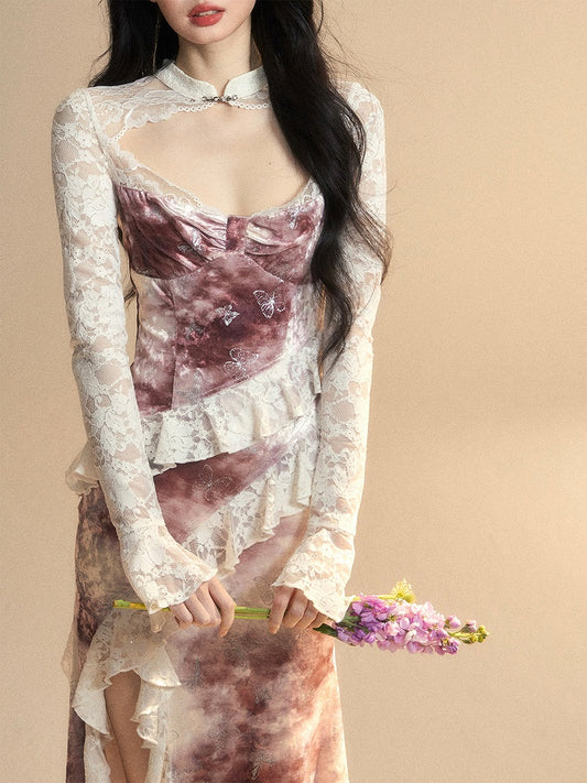 Side Brick Red Slit Vintage Hem Dress Sleeves Cutout Detail Lace Patches Ruffled