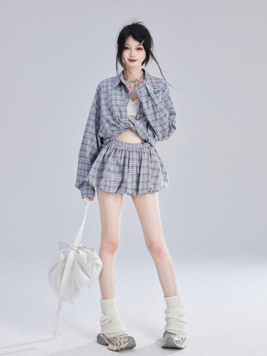 Loose Blue White Plaid Vintage Shirt/Bubble Skirt