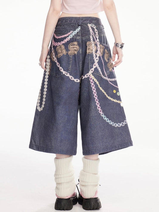 Colorful Rise Vintage Wide-Leg Denim Shorts Chain Print Blue Low