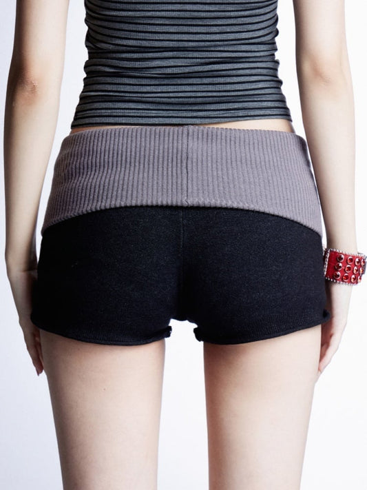 Elastic Waist Vintage Design Knitted Shorts Black and Gray Colorblock