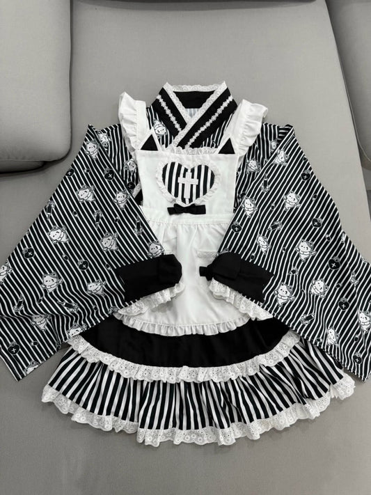 Black Striped Little Ghost Print Top + Tiered Skirt + Apron Wa Lolita Set