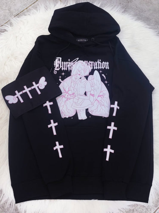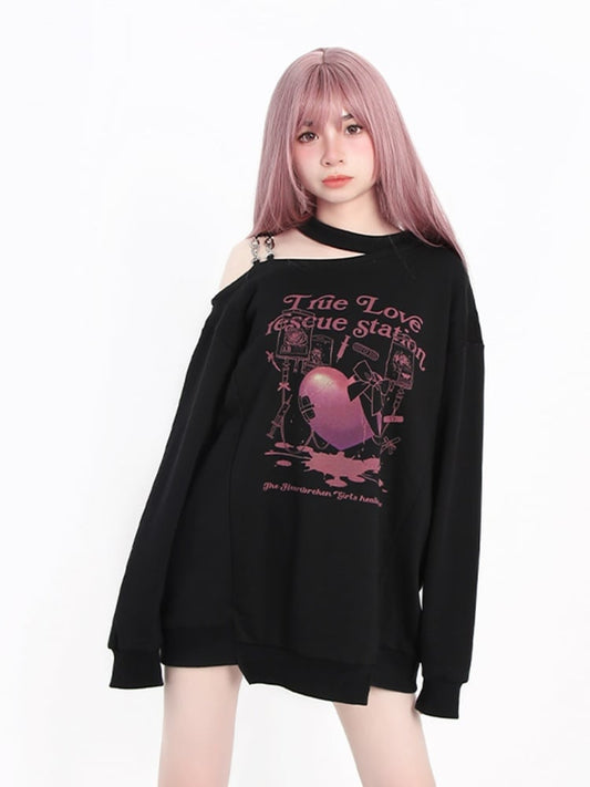 Black Cutout Shoulder Heart and Bowknot Print Top