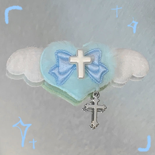 Blue Pink Plush Cross and Bowknot Heart-shaped Hairclip