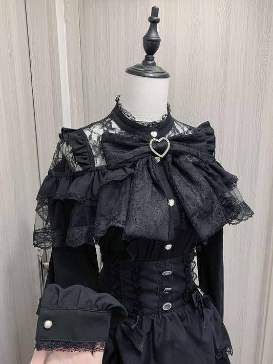 Rüschenbluse mit Jirai Kei Herzknöpfen Schleife Große Ärmel Schwarz/Weiß Illusion Ausschnitt Stufen Lang