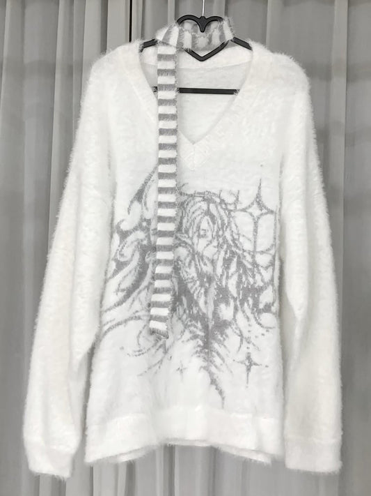 Faux with Gray/Black Cat Off-Shoulder Motif Sweater Fur