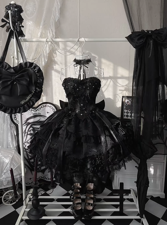 Jacquard Waist Blooming Lolita Basque Flower Accents Lace Hime Black Layered Fluffy Dress with