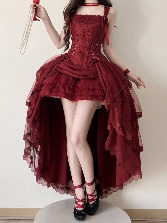 Layered Red Boned Corset Lolita + Top High-low Skirt Tulle Classic