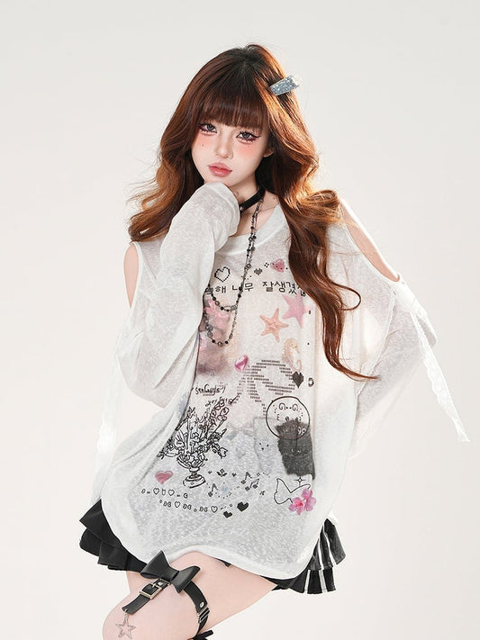 Süßes Coverup mit Mädchen-Print, weißer asymmetrischer Ausschnitt