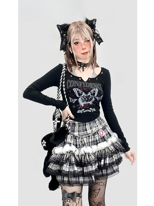 Schwarzer Stufenrock mit Spitzenbesatz und Karomuster