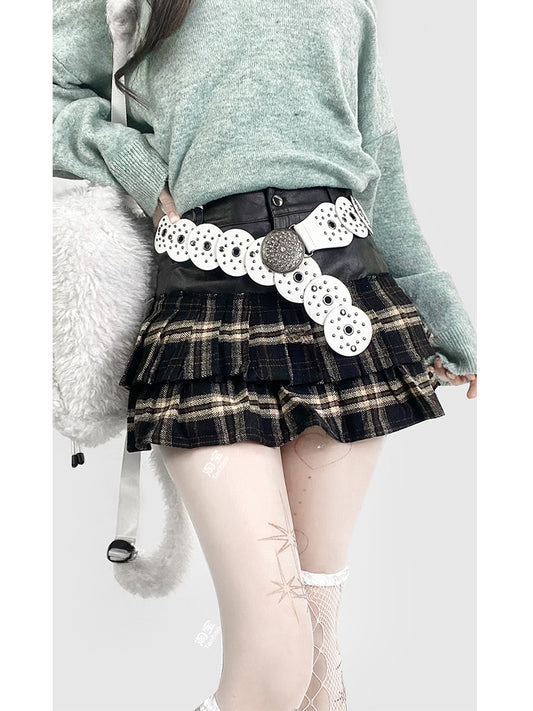 Schwarzer karierter Faltenrock mit Schnallengürtel