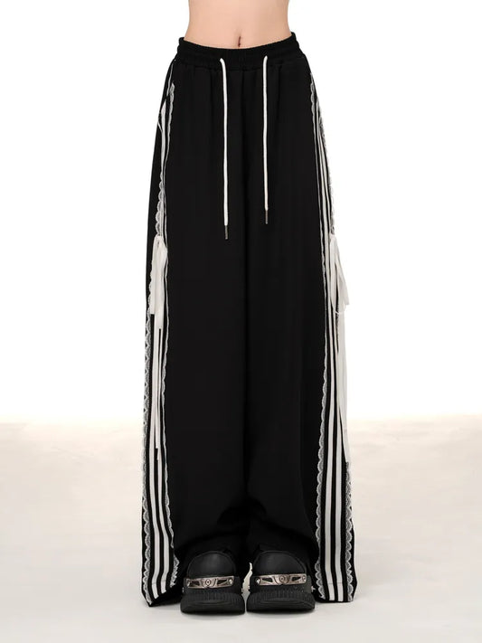 Schwarze Blokette Core-Hose mit weitem Bein und Spitzenbesatz