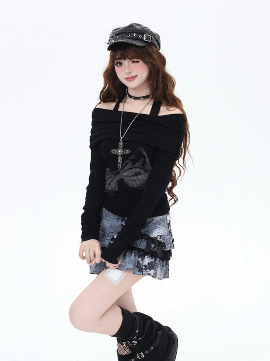 Schwarzes Top mit schulterfreiem Ausschnitt und Schleifenmuster