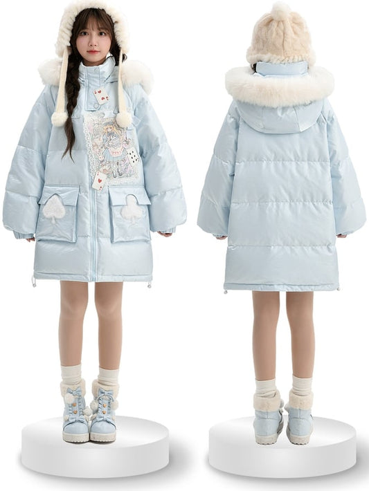 Blauer Daunenmantel mit Kapuze und Applikation