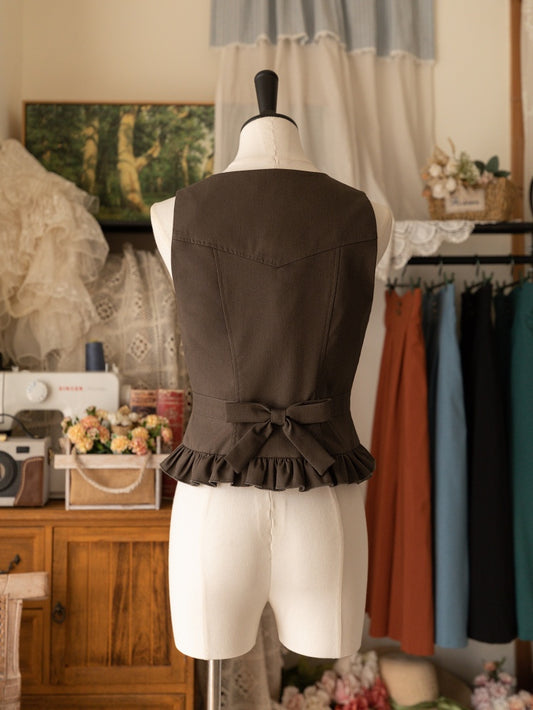 Braune Weste mit Rüschenbesatz und Knopfleiste vorne