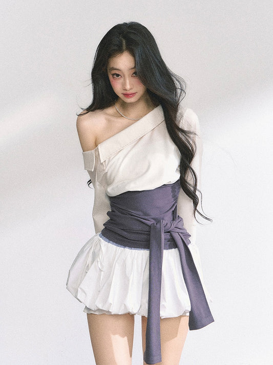 Beiges Hemd mit asymmetrischem Ausschnitt und lila Korsettgürtel