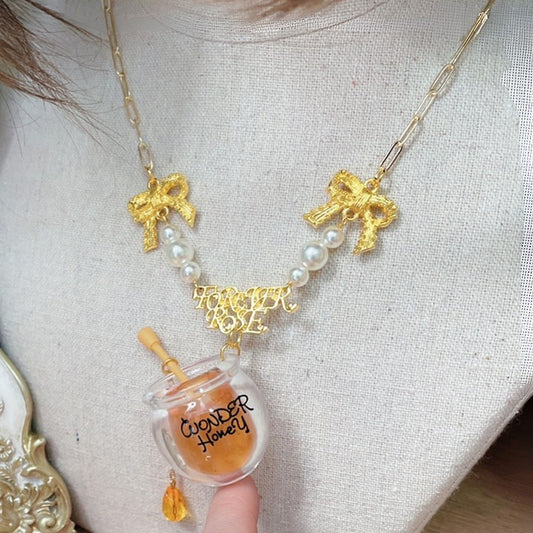 Gelb verzierter Perlen-Honigtopf-Anhänger und Halskette mit Schleife