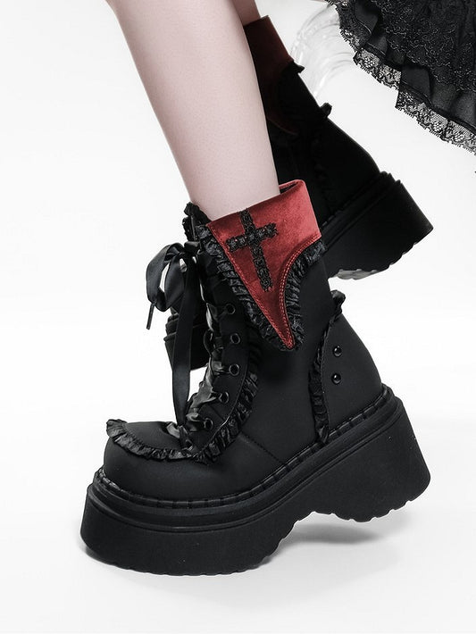 Red Gothic Studded Ankle with Accents Cross Boots Platform Details Black