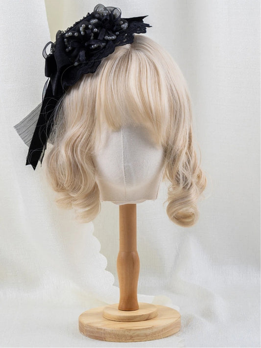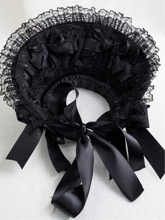 Bowknot Bonnet Gothic Lolita Beaded Lace Tassel Accents Black