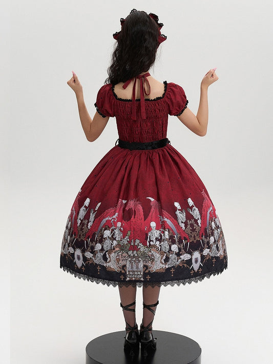 Lace Trim Black Dress Red Lolita and with Cross Print Skeleton Gothic