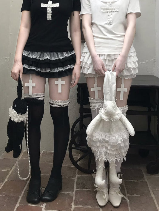 Trim Black/White Gothic Mini Tiered Lace Skort with