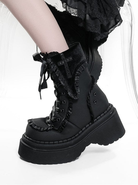 Ruffle Chunky Black Gothic Accents Dual Platform Closure Boots with