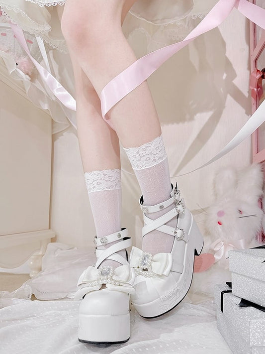 Matte Strasssteine und Schleife Weißer Block Kei auf hohem Plateau Perlenbesetztem Jirai-Absatz