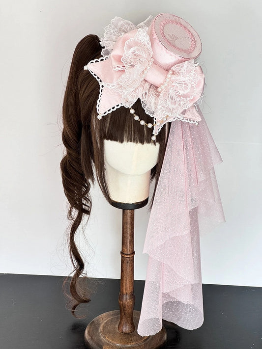 Pink (Lace Pearl Veil Lolita Pastel Mini with Hat Head Accents)