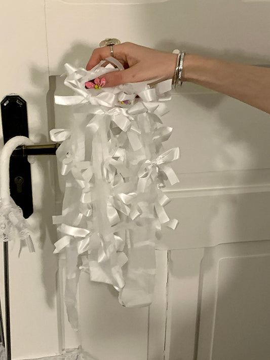 Strümpfe mit Schleife, überkreuzt, übers Knie, weiß, gebändert, Y2K-Details