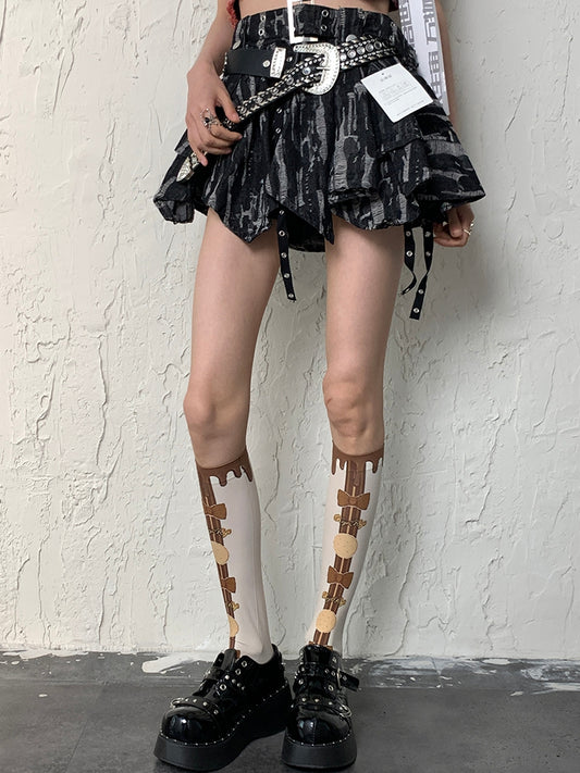 Cookie Print Y2K Bowknot und weißbraune Unterknee-Bittersüße Strümpfe
